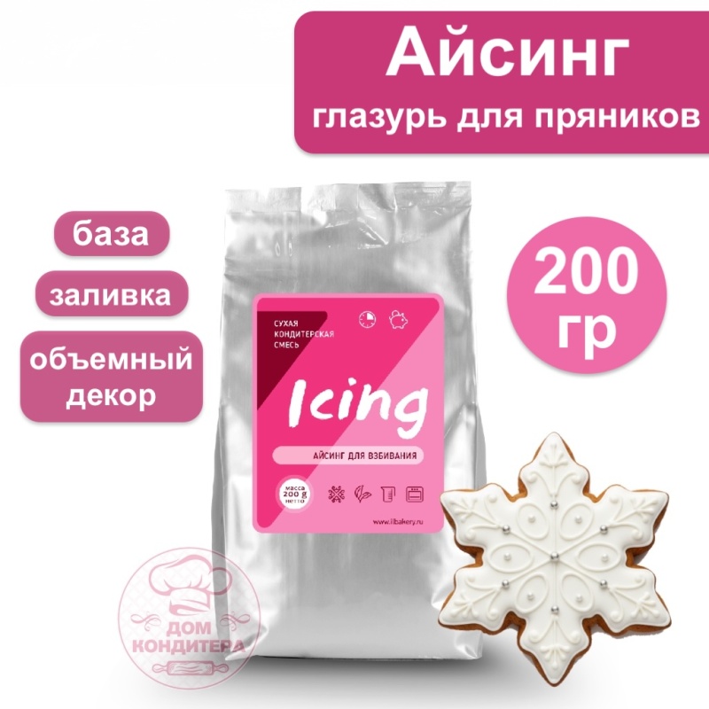 Просейте. Перемешайте смесь с водой 60С в данных пропорциях. 1000 гр смеси + 150 гр воды* (кипяченой или бутылизированной) для получения консистенции “база”. Дайте настояться несколько минут и взбейте на средних оборотах в планетарном миксере (1-4 мин) насадкой “лопатка” или ручным миксером на скорости чуть выше среднего (3-8 мин).возможно другое время, все зависит от миксера, ориентируйтесь на текстуру. Масса должна побелеть, увеличиться немного в объеме, клюв от насадки должен быть мягким, но держать форму. Рекомендуется не перевзбивать айсинг до крепких пиков, это даст матовую поверхность, но быстрое высыхание. Массу переложите в емкость, плотно закройте. Взбитая смесь может храниться до 14 дней* в холодильнике в базовой консистенции (перед применением перемешать).