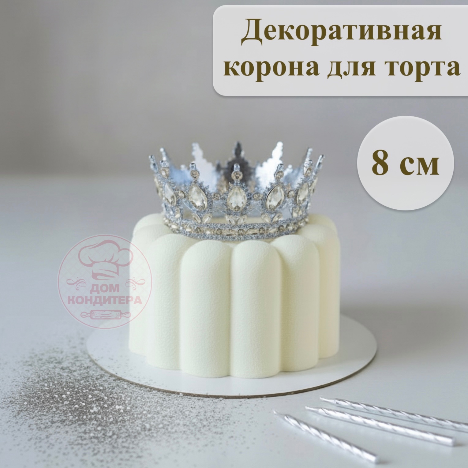 —Декоративная корона для торта, 8 см, серебро с белыми камнями